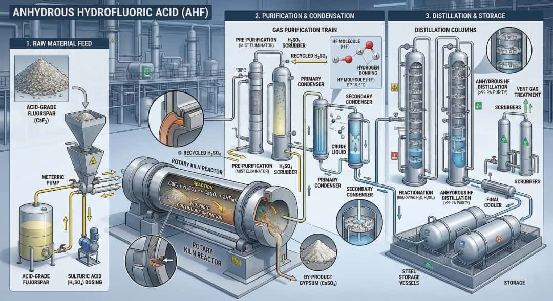Anhydrous Hydrofluoric Acid is made industrially from acid-grade fluorspar (calcium fluoride) and sulfuric acid. The two raw materials react in a heated process, typically involving a prereactor and externally heated rotary kiln, to produce hydrogen fluoride gas and calcium sulfate. The gas then passes through dust removal, precondensation, condensers, scrubbers, and finally distillation. That distillation step upgrades crude hydrogen fluoride into high-purity AHF, typically around 99.98% purity, while lower-strength hydrofluoric acid products are made later by adding water in a controlled way. (US EPA)